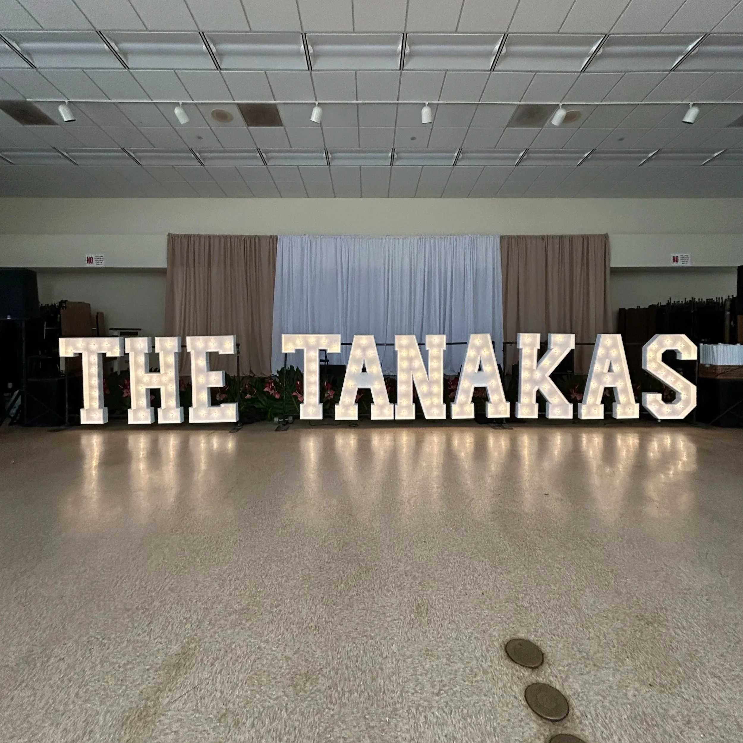 Our LED Marquee Collection features the full alphabet, numbers, and symbols with customizable lighting in white, blue, red, green, purple, or yellow. Whether it’s a wedding, proposal, or company event, these glowing letters create atmosphere with a touch of magic.