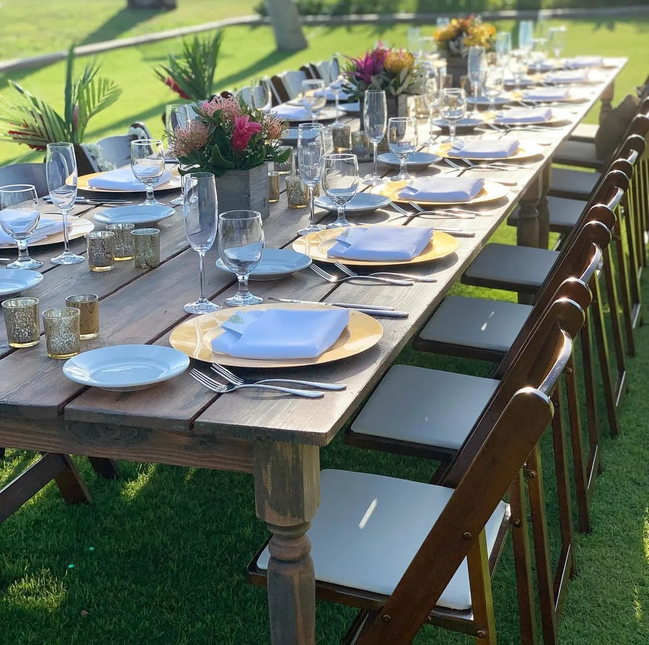 Every great gathering starts around a table. These pieces form the foundation of your event, shaping how people sit, eat, and connect. From handcrafted farmhouse tables to round and foldout options, each one brings its own personality and purpose.